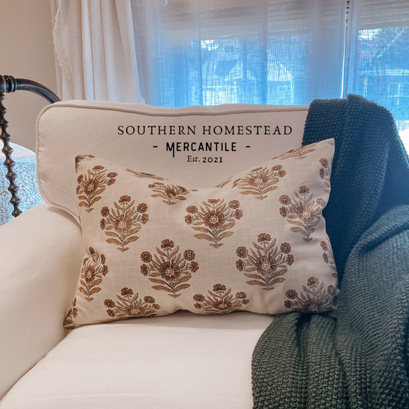 This generously sized lumbar pillow displays a block-printed floral pattern in warm, sun-washed shades, making it a simple yet charming addition to your seasonal decor. Constructed from soft, sturdy cotton, it includes a concealed zipper and a high-quality insert, perfect for enhancing sofas, entryway benches, or bedding arrangements with comfort and style. Mix and match with our Autumn Collection to create the perfect pillow combination.