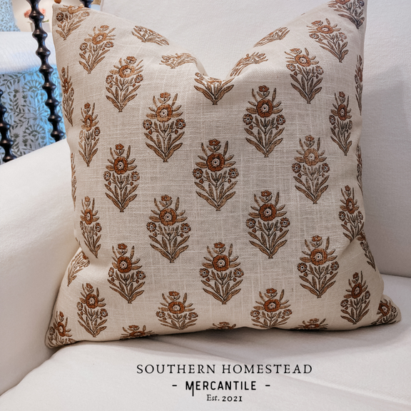 This beautiful pillow displays a block-printed floral pattern in warm, sun-washed shades, making it a simple yet charming addition to your seasonal decor. Constructed from soft, sturdy cotton, it includes a concealed zipper and a high-quality insert, perfect for enhancing sofas, entryway benches, or bedding arrangements with comfort and style. Mix and match with our Autumn Collection to create the perfect pillow combination.