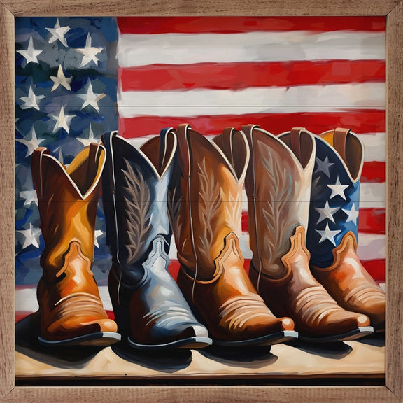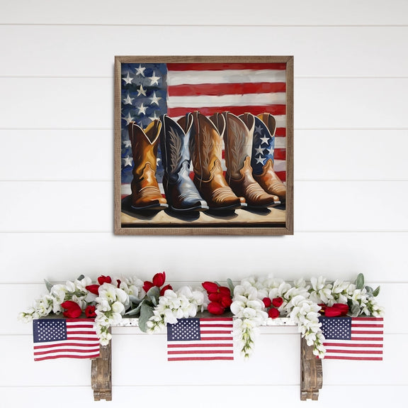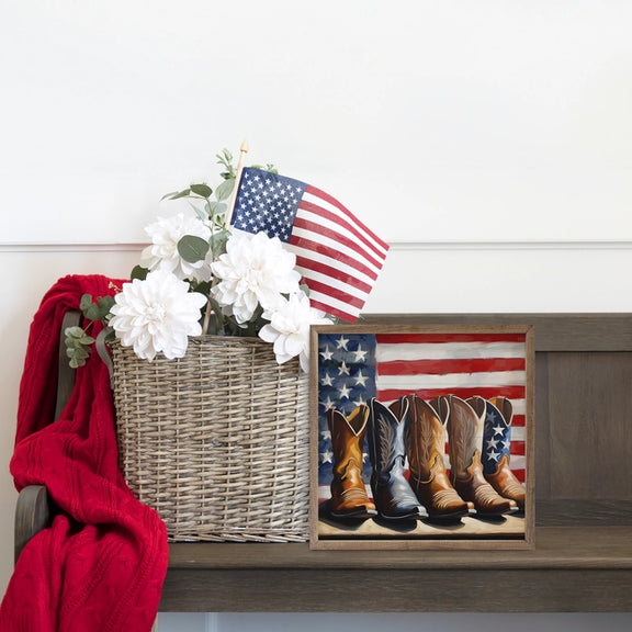Express your love for America by displaying our stunning hand-crafted sign. Proudly made in the USA, our American Flag with Boots Sign adds a touch of patriotism to any home. Order yours today to bring beauty and charm to any wall or shelf in your home! This one-of-a-kind piece is crafted from high quality American hardwood planks, hand painted, and printed with UV cured ink. It is framed in a natural walnut frame and each piece has its own unique personality, marks, wood grain, and look. To keep it looking pristine, simply wipe with a dry cloth.