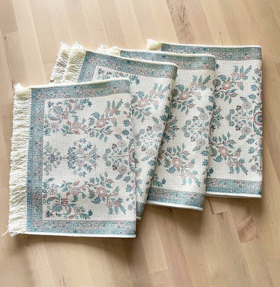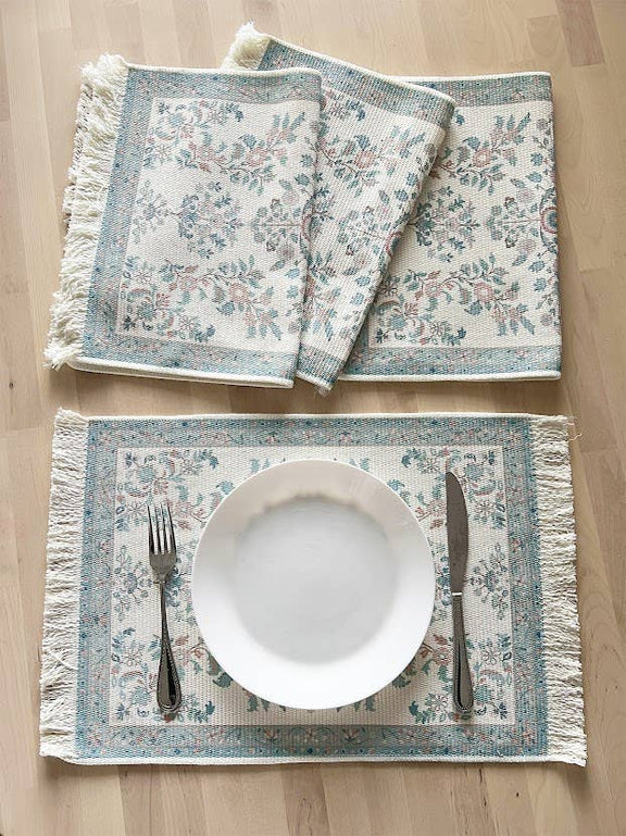 Bring warmth and charm to your table with the Antique Print Placemat in Blue. Featuring an antique-style design and delicate fringe detail, it beautifully resembles a vintage rug, creating an inviting atmosphere for every meal.