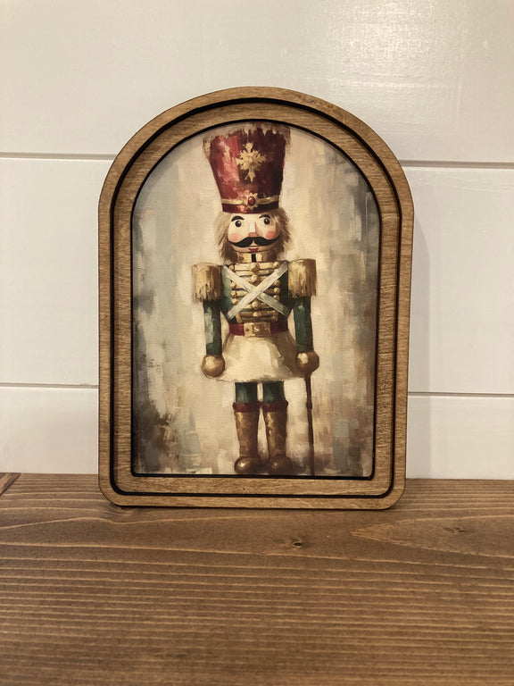 Introduce a nostalgic flair to your holiday decorations with the Vintage Nutcracker Framed Art. This distinctive artwork is presented in a wooden frame with a stylish arch top and printed on premium canvas using deep, vibrant ink. It’s an excellent way to add warmth and charm to your shelf, mantle, or gallery wall.