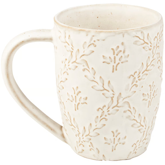 Handcrafted stoneware mug featuring a soft cream matte glaze with tactile embossed vine patterns that add rustic charm and visual interest. The neutral palette pairs effortlessly with any table setting, making it ideal for daily coffee, tea, or your favorite beverage. At 10 oz., it's the perfect size for cozy mornings or casual gatherings. Hand wash to preserve the artisanal finish.