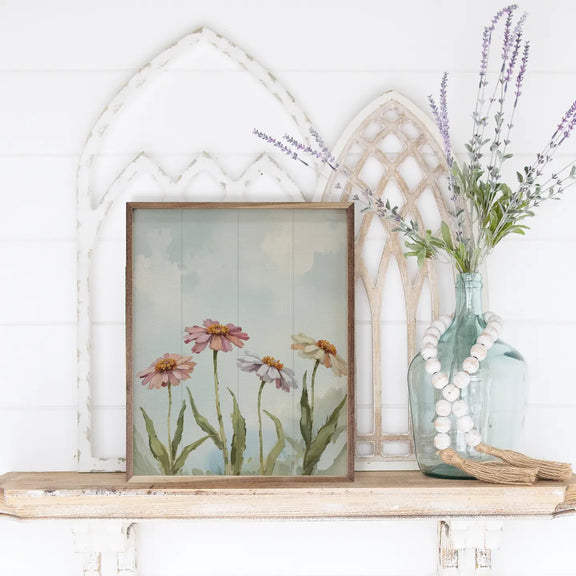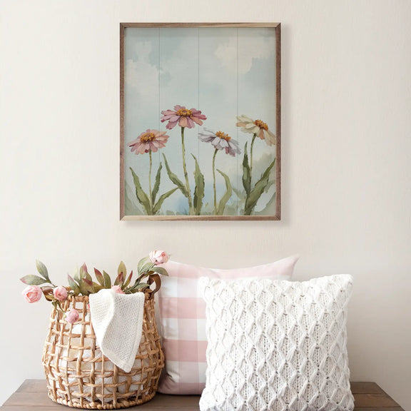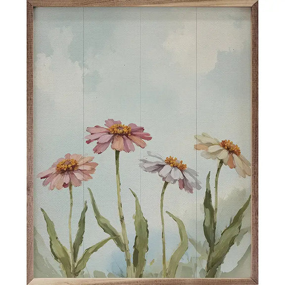 Brighten any room with the beautiful Field of Zinnias Art. Crafted from premium American hardwood and expertly printed with UV ink, this charming piece is framed in natural walnut and adds beauty and character to any wall or shelf. Each artwork is truly unique, featuring its own distinct personality, markings, and wood grain. Keep it looking its best with a quick wipe of a dry cloth.