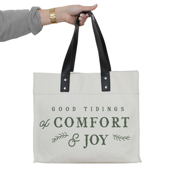 The Good Tidings Market Tote is the perfect accessory for any shopping trip or gift-giving occasion. Its durable canvas construction and brown leather handles make it both practical and stylish. Plus, with an interior pocket and sweet sentiment "Good Tidings of Comfort & Joy", it's a bag that keeps on giving.