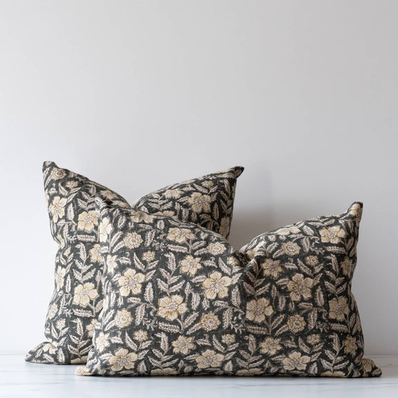 Experience the beauty of Greta - a stunning botanical block print, showcasing a delicate floral design on a rich green linen. This unique motif brings a touch of rustic charm and intricate artistry to any room, creating a charming cottage vibe.