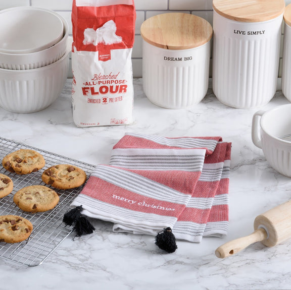 Cozy up your kitchen with this whimsical holiday-themed cotton kitchen towel, featuring festive colors, playful tassel accents, and an elegant "Merry Christmas" embroidered sentiment. This machine-washable towel will bring Christmas cheer to any kitchen. 🎄