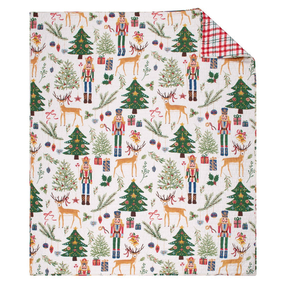 Transform your space into a holiday haven with the Nutcracker Quilted Throw. This reversible design celebrates the season's warmth and wonder with festive Nutcracker characters and holiday motifs on one side, complemented by a timeless green, red, and white tartan plaid on the reverse. Available in sophisticated green, red, white, and taupe colorways, it's the perfect accent for any room. Built to last, this versatile throw brings enduring seasonal elegance to your home year after year.