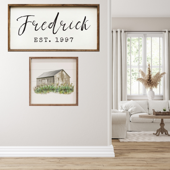 Add charm and character to your home with this personalized wood sign. The frame is made from natural walnut, the background is hand painted and designs are printed with UV ink. Our Kendrick Home signs are made for Southern Homestead Mercantile and crafted for the highest quality. Each sign is made to order with a wide range of sizes and styles meant to fit any space in your home.