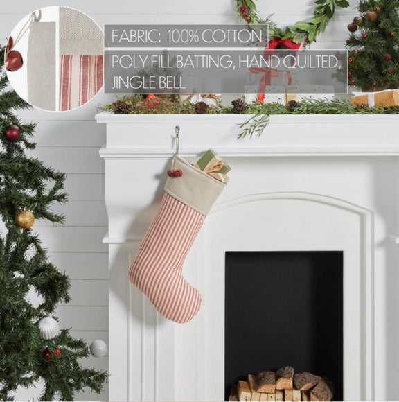 Bring a classic country feel to your home with the timeless Sawyer Mill Red Ticking Stripe Stocking! This beautiful piece features a red and tan ticking stripe base, complete with an elegant light tan cuff with two red bells and a hanging loop. Make this year's Christmas one to remember with a timelessly classic vintage farmhouse style.