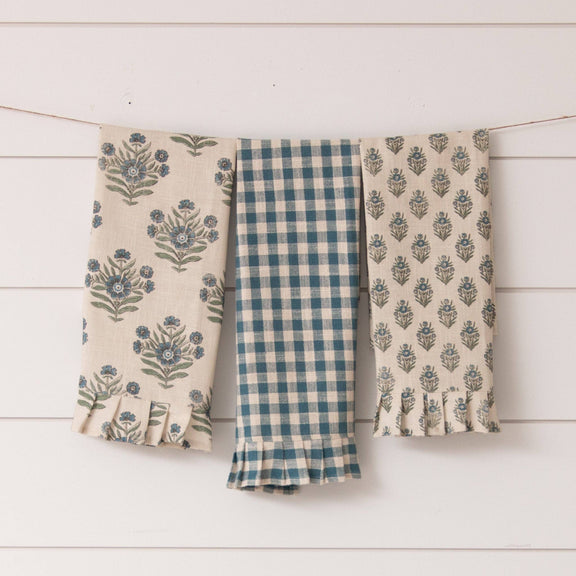 Introducing our Blue Block Print Tea Towels, perfect for adding a touch of cottage core style to your home. Featuring three charming prints and delicate ruffle details, these tea towels are not only stylish but also functional. Bring some whimsy into your kitchen with these lovely tea towels.