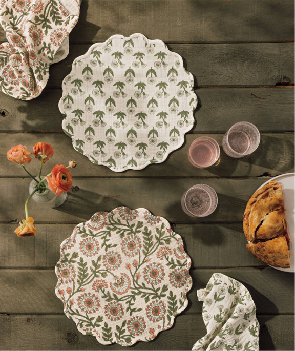 With its airy and inviting design, the three layer gauze Thicket Scalloped Placemat is the perfect addition to any gathering. Featuring a charming scalloped border and printed botanical pattern, this placemat adds a touch of freshness to your table.