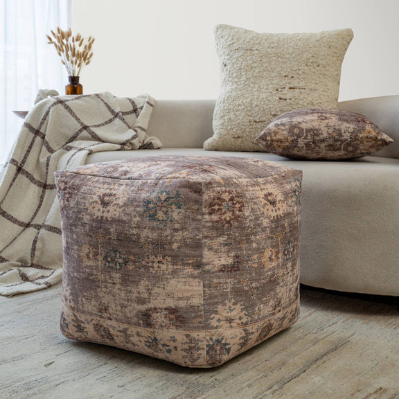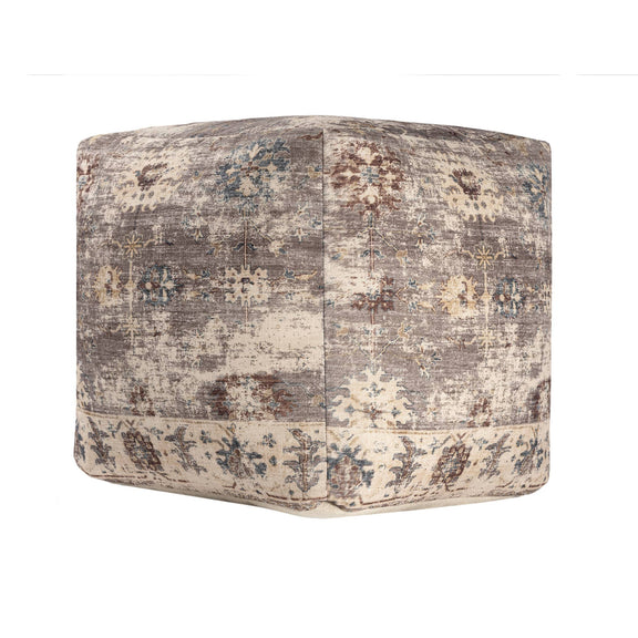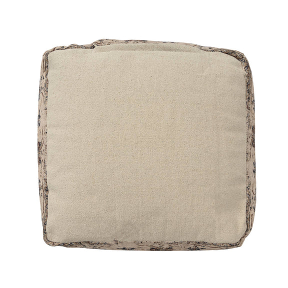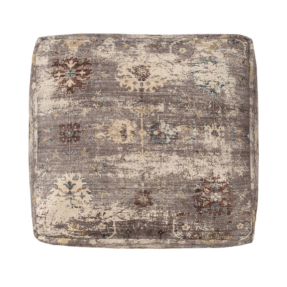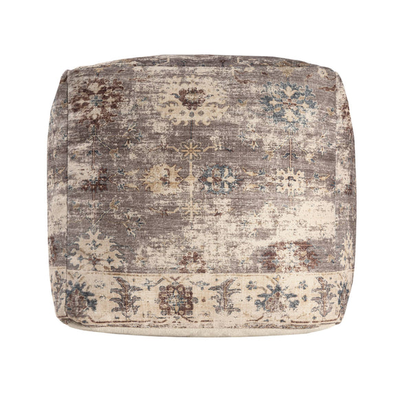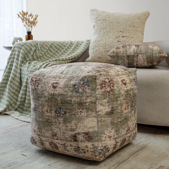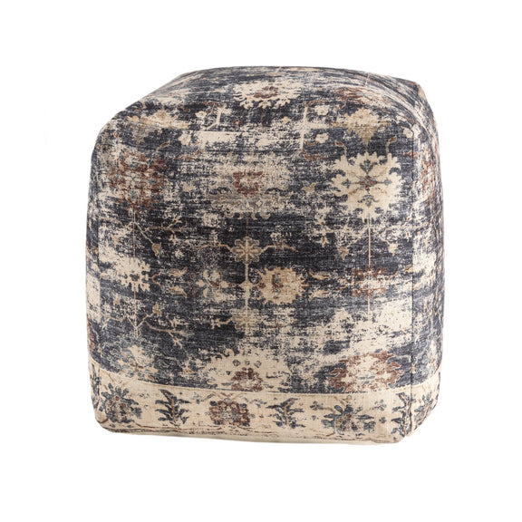Bring a vintage-inspired touch and cozy versatility to your space with the Vintage Floral Pouf Ottoman. Showcasing a distressed floral design in navy and beige, gray and beige, or green and beige, this square pouf adds a bold vintage accent to any room. Ideal as a footrest, extra seating, or a casual side table, it blends style and function seamlessly. The textured fabric mimics a timeworn rug for a lived-in, old world feel—perfect for living rooms, reading corners, or bedrooms. Expertly power-loomed in India by skilled artisans for durability and intricate craftsmanship. Made from 100% polyester with EPS ball filling for shape retention, and finished with a zipper closure for easy care. The filling is removeable so that you can adjust the height and softness. Fits effortlessly with vintage, farmhouse, or cottage décor.